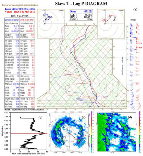 Figure 11a shows a Skew T-Log P diagram provided by KMA. The bright band peak (37.9 dBZ) occurred at a height of around 3.4 km (Figure 11b) at 17:40 LST on 2 May 2016. The freezing level was also at around 3.4 km at the time (according to an upper-air observatory in Osan located nearest to the X-band radar site), and weak reflectivity was prevalent (less than around 30 dBZ) (Figure 11c,d). The bright band appeared from 15:00 LST on 2 May 2016 to 23:50 LST on 2 May 2016. However, we confirmed that bright band contamination prevented the overestimation of the corrected reflectivity (Figure 10h–l) because most RBHs of the X-band and the S-band were below 3.4 km (Table 4). Cunningham et al. used reflectivity at an elevation angle of 1.6 and an area between 20 km and 80 km from the radar’s center was used to avoid bright band contamination and ground clutter.