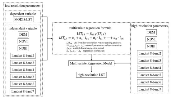 In the following building process, low-resolution parameters comprised two parts, namely, dependent and independent variables. LST was set as the dependent variable, and independent variables consisted of DEM, NDVI, NDBI, and band 2 to band 7 of Landsat 8. According to the low-resolution variables, we used the least squares method to build an MLR model, as shown in Equations (4) and (5) [26]. The LST at high resolution was estimated based on the p corresponding independent variable and multiple regression models.
