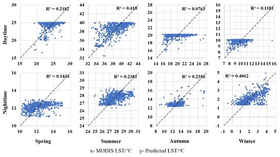 Scatter diagrams of predicted LST data based on the MLR models (y-axis) versus MODIS LST data (x-axis). (The black dashed lines represent the 1:1 line; that is, the predicated LST and MODIS LST of the scattered points falling on this line are equal).