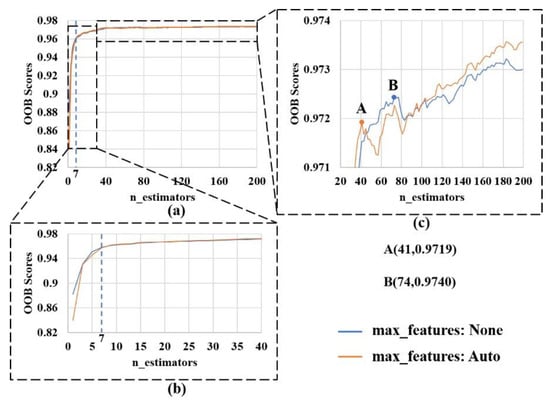 In order to prevent underfitting of the RF model, in the tuning process, we increased n_estimators to improve the model’s fitting ability; when the Out Of Bag (OOB) scores did not significantly improve for the first time, the value of n_estimators was optimal (Point A and B in Figure 8). Meanwhile, we adjusted max_features and set it to None (blue line in Figure 8; max_features are the square root of the sample features) and Auto (orange line in Figure 8; max_features are the sample features).