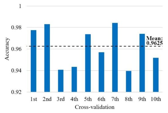 Combining the predicted results of the above two models, the fitting degree of winter night was the highest. Thus, we took winter night as an example of parameter tuning. When all parameters were set to default values, the OOB score was 0.9621. When n_estimators increased from 1 to 7, OOB scores rose rapidly, then tended to be flat. According to Figure 8c, the orange line reached the first maximum OOB scores (OOB score = 0.9719), Point A, when n_estimators was 41. When n_estimators was 71, the first maximum OOB score of the blue line was 0.9740, Point B. Consequently, Point B was the best parameter combination as shown in Table 4. After parameter tuning, we obtained the optimal combination corresponding to an OOB score of 0.9740, which was 0.0119 higher than the original OOB score. Then, we combined the training samples and test samples to perform a total of 10 cross-validation on the optimal model based on the cross_val_score module to verify whether the model was good fitting. The 10-fold cross-validation results are shown in Figure 9. The mean of accuracy was about 0.9625. The fourth cross-validation had the highest accuracy, of about 0.9834, and the lowest was the ninth, of about 0.9396. The mean squared error (MSE) of the training sample was about 0.025 °C and that of the test sample was about 0.053 °C. The MSE of test samples was slightly higher than that of training samples, indicating that the model was not overfitting. Overall, the cross-validation results meet the requirements; that is, the optimal RF model could be used in the subsequent downscaling research.