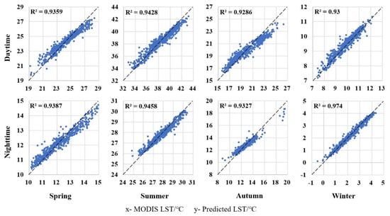 Scatter diagrams of predicted LST data based on the RF models (y-axis) versus MODIS LST data (x-axis). (The black dashed lines represent the 1:1 line; that is, the predicated LST and MODIS LST of the scattered points falling on this line are equal).
