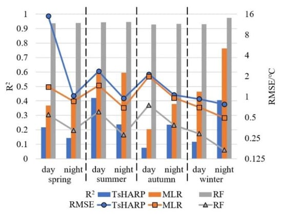 To summarize, R2 and RMSE were calculated for MODIS/LST products and predicted LST, as shown in Figure 12. The histogram shows R2, and the line chart shows RMSE, of various models. Blue, orange, and gray represent the TsHARP, MLR, and RF models, respectively. The results clearly show that the RF model was more suitable for this research than the TsHARP and MLR models. This is evident in the significantly higher R2 and lower RMSE of the RF model compared to the other two models. For the RF model, the prediction effect at night was better than that during the daytime, and that at winter night was the best, with R2 of 0.9740 and RMSE of 0.1678. The worst effect was for autumn daytime: R2 was 0.9286 and RMSE was 0.7556. However, even the worst RF model performed better than the other two models. From a seasonal perspective, R2 values in summer and winter were higher than those in spring and autumn. From low to high, RMSE values were winter, spring, summer, and autumn. By comparison with the single-factor TsHARP model, the prediction improvement of the MLR model with more independent variables was limited due to the simple linear regression. The application of the RF model greatly enhanced the model’s predictive capabilities, because, under the premise of multiple factors, machine learning could perform complex nonlinear regression. According to the above model selection and precision analysis, we only selected the RF model to undertaken downscaling of MODIS/LST products from 1 km to 100 m.