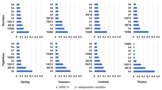 During the construction of nonlinear regression models, the RF model was able to provide feature importance based on randomized variable selection. The importance scores were presented in mean squared error (MSE). The larger the MSE of an independent variable, the more important that variable is to a model [54]. Figure 13 shows the independent variable importance scores from all research data; the x-axis represents MSE, and the y-axis represents the independent variables. Among the independent variables, b2 to b7 represent Band 2 to Band 7 from Landsat 8 OLI. During daytime, the importance scores of various factors were relatively balanced, and the difference between high and low score factors was large at night, especially at winter night. The b6 score reached 43.2%; in comparison, the highest score in daytime was 30%, for NDBI in winter. At night, b5 and b6 were the most important, with high scores. Meanwhile, DEM played a major role in the RF models at night. Contrary to nighttime, DEM scores in daytime were not large. According to the Environmental Lapse Rate [55], high-altitude areas usually received more solar radiation with more xeric and warmer conditions, particularly north-facing slopes. In the current research, different orientations resulted in a significant difference of LST. Therefore, the effect of DEM is weak when receiving solar radiation [56]. NDBI during daytime played a key role in the RF models, with the highest scores in summer, autumn and winter and the second highest in spring. This meant that buildings heated by solar radiation had a significant influence on LST. By contrast, at night without solar radiation, NDBI had lower importance scores than DEM.