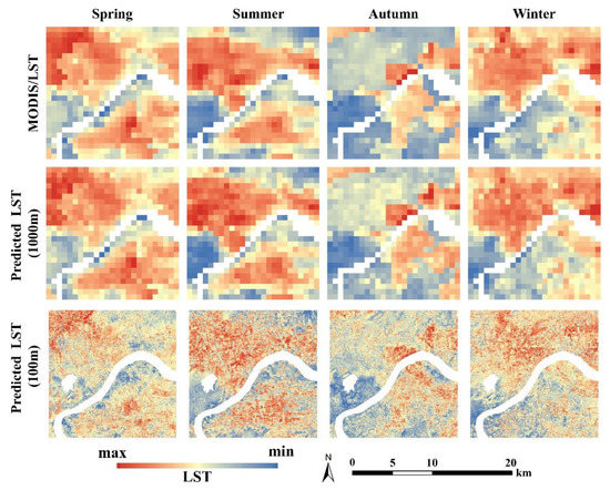 Predicted and downscaling results during daytime at different scales in various seasons from MODIS/LST products.