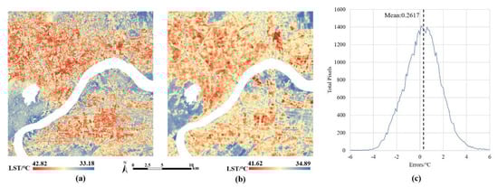 Validation results during summer daytime: (a) downscaled LST with a resolution of 100 m; (b) retrieved LST with a resolution of 30 m; (c) error distribution histogram between downscaling LST and real LST. (the black dashed line represents the mean value).