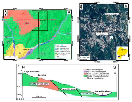(a) Geological sketch map wih Cross section (A–A’); (b) the study area with the location of pictures (a, b, c) in Figure 2; (c) Simplified cross-section of Portovelo-Zaruma field (modified from [19]). Reference system: WGS84-UTM-17S.