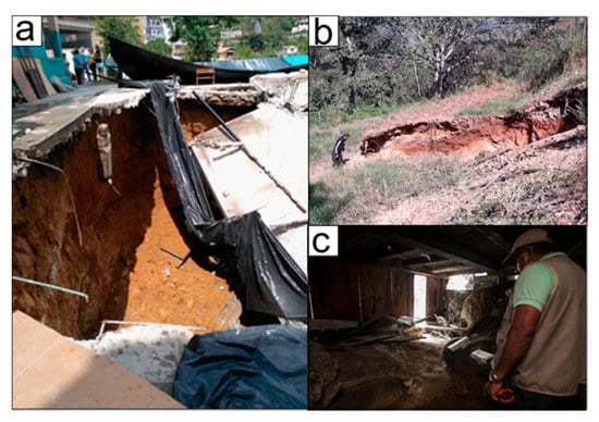 (a) Sinkhole near the school “Inmaculada Fe y Alegria” [26]; (b) subsidence in Zaruma [27]; (c) tunnel under city patrimonial zone [28].