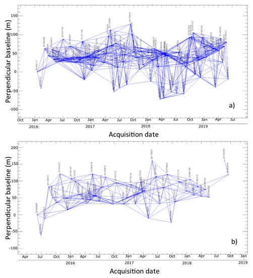 The datasets available from this study consist of 89 images acquired in ascending geometry with a time-revisiting variable between 12 and 36 days in the time span January 2016–June 2019, and 51 images acquired in descending geometry with a time-revisiting variable between 12 and 96 days in the time interval June 2015–September 2018. From all possible pairs of interferograms, only those characterized by spatial and temporal baseline thresholds of 50 m and 150 days, respectively, have been selected. In particular, 793 and 271 interferograms in ascending and descending orbits, respectively, have been identified (Figure 4).