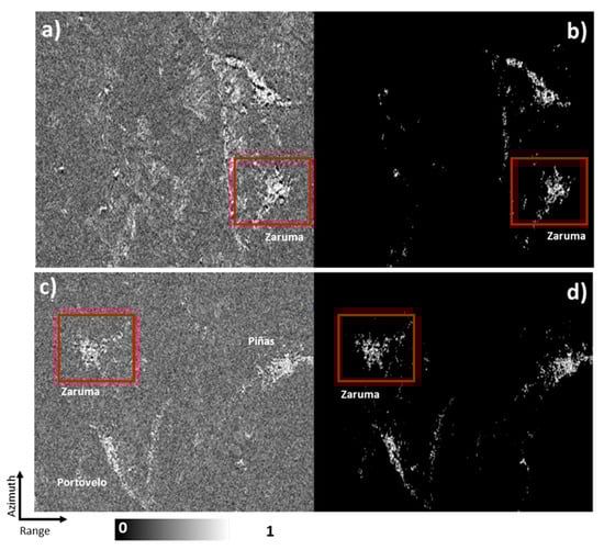Temporal sublook coherence maps: ascending (a), and (c). Stable coherence scatterers (SCS) maps: (b) ascending, (d) descending.