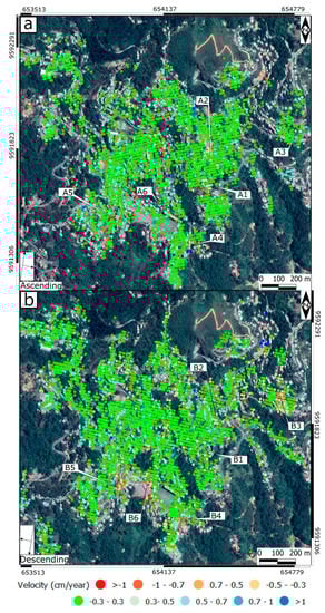 Mean displacement rate map: (a) ascending orbit; (b) descending orbit. A1–6 and D1–6, ascending and descending, respectively, are points for which vertical and horizontal components have been calculated (see Discussion section).