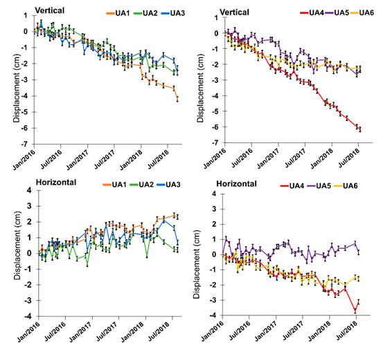 The time series of cumulated vertical and horizontal components. Displacement standard deviation, for each differential interferometric synthetic aperture radar (DInSAR) measurement, are also reported (black).