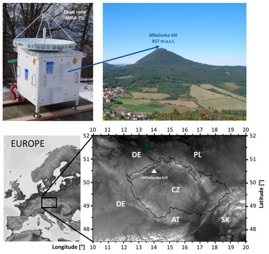 A vertically-oriented Ka-band cloud radar MIRA 35c manufactured by METEK Gmbh (http://metek.de/) was mounted at the top of Milešovka hill (837 m a. s. l.) at a meteorological observatory (Figure 1) in Central Europe (northwestern Czechia; 50°33′18″ N and 13°55′54″ E) in March 2018. The polarimetric cloud radar (i.e., cloud profiler) works at a frequency of 35 GHz. After calibration of the instrument, the radar began operating in June 2018. Table 1 provides the reader with the technical specifications of the radar.