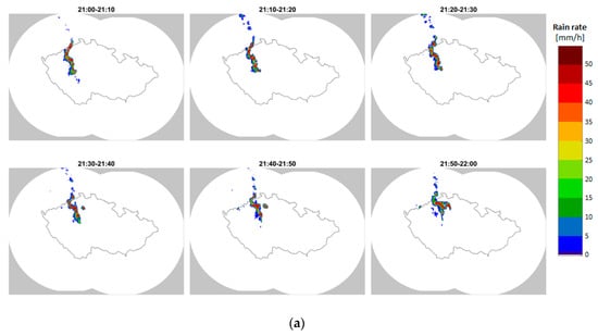Figure 2 shows the temporal evolution of rain rates (as derived from C-band weather radar data, Figure 2a) and lightning discharges (Figure 2b) during one hour of the thunderstorm on 10 June 2019, when most lightning activity was observed close to the Milešovka hill. The temporal evolution is displayed with a time step of 10 min. Based on rain rates (Figure 2a), it is clearly visible that the thunderstorm was severe, at least within the central European context.