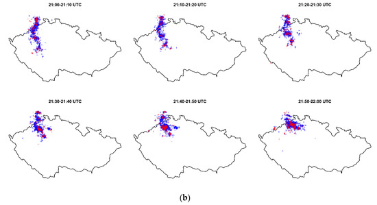 Temporal evolution with a 10-min time step of (a) rain rates derived from C-band weather radar data (radar circle domains having a radius of 250 km) and (b) lightning discharges between 21 and 22 h UTC as registered by EUCLID network on 10 June 2019. Note that in (b), blue symbols represent Cloud-to-Cloud (CC) flashes while red symbols display Cloud-to-Ground (CG) flashes. The Milešovka position is shown in Figure 1.