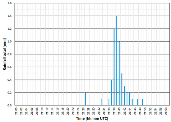 Figure 3 depicts precipitation totals with a time step of 1 min, as registered by a rain gauge with a resolution of 0.1 mm at the Milešovka observatory between 21 and 22 h UTC on 10 June 2019. Note that rain rates (i.e., precipitation intensities, Figure 2a) cannot be directly compared with recorded precipitation totals (Figure 3) as they do not represent the same information. Figure 3 shows that the highest 1-min precipitation total occurred between 21:39 and 21:40, while the closest lightning was recorded at 21:37 and 50.341 s. This confirms that lightning flashes may occur prior to heavy rain. Here, we note that measured precipitation totals by the rain gauge might be underestimated. The reason is that at the top of Milešovka hill, strong winds frequently appear during storms, which may result in an underestimation of rainfall totals due to the blowing away of the precipitation from the surface of the rain gauge.