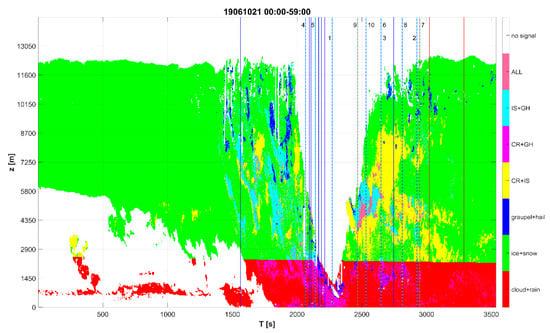 Figure 6 shows the evolution of hydrometeor distribution (resulting from Hclass, Section 2.3) on 10 June 2019 from 21:00 to 21:59 UTC. Clearly, the lack of data in the vertical profiles between approximately 21:30 and 21:40 makes the interpretation of the obtained results difficult, especially because many NL discharges occurred at that time. Nevertheless, the majority of the ten closest discharges (Figure 6) occurred after 21:40, when we had data again, covering almost all the troposphere.