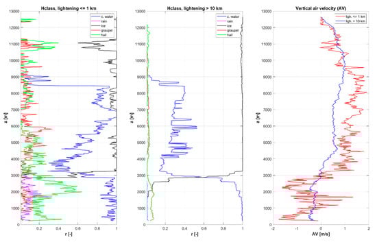 Taking into account the distance of the lightning from the observatory, we do not know whether the radar measurements took place in the frontal or back side of the thunderstorms or on their lateral sides. The placement within the thunderstorm may lead to diverse directions and values of AV, which can be confirmed by high variability of AV (not depicted). In addition to the uncertainty regarding the localization of measurements with respect to the movement and development of thunderstorms, it should be emphasized that we present results and quantities that are derived indirectly (i.e., not directly measured). Therefore, the results cannot be explicitly verified. However, we can state that the obtained results are in accordance with the general knowledge about thunderstorms. Therefore, we believe that the technique used to calculate the vertical air velocity and to classify hydrometeors give realistic results.