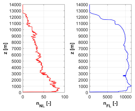 Overall, AV seems to be quite low, which is caused by averaging. The variability in AV among gates seems high for NL. This is caused by much lower number of NL discharges (990) as compared to FL discharges (171,754), as shown in Figure 9. Concerning FL, AV does not fluctuate much on average between neighboring gates, which is due to large number of processed data. Figure 8 also shows that for FL, downward motion prevails from the ground up to 3000 m, while upward motion dominates the layers above 3000 m on average.