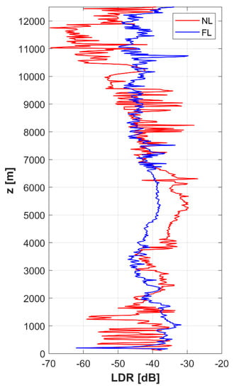 To better assign the cause of increased LDR averages in the middle troposphere, Figure 11 shows 1 km layers of frequency of LDR in profiles with similar distribution of graupel and hail (i.e., rounded hydrometeors). Because concentrations of graupel and hail are similar in both NL and FL (ice or snow being present almost everywhere in these 1 km layers, Figure 8), it is obvious that there had to be another process that made the higher LDR more frequent in the case of NL as compared to FL. We suggest that the additional process could be the alignment of ice crystals observed by other researchers, e.g., by Melnikov et al. [25]. However, we are aware that this hypothesis cannot be exactly verified.