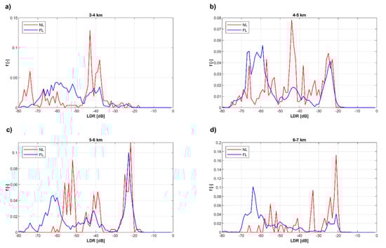 Frequency of LDR (f[−]) at an elevation of: (a) 3–4 km, (b) 4–5 km, (c) 5–6 km and (d) 6–7 km during thunderstorms observed at the Milešovka observatory for NL (red curve) as compared to FL (blue curve), when taking into account similar vertical profiles of graupel and hail concentrations. Y-axis represents the height [m] above the cloud radar situated at an elevation of 837 m a.s.l.