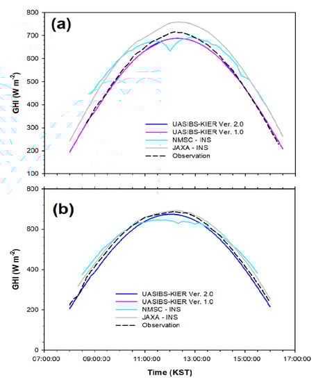 As illustrated in Figure 2b, a similar behavior of the NMSC-INS model is seen in FUA, with estimated GHI lower than that observed at noon. Contrastingly, GHI is overestimated when sun elevation is low at both stations. Contrary to the NMSC-INS model, other estimates from the UASIBS–KIER and JAXA-INS models are consistent with the observed GHI. Therefore, the retrieval process needs to be fixed for it to be improved for the NMSC-INS model to capture the GHI when the sky is clear (Figure 4).