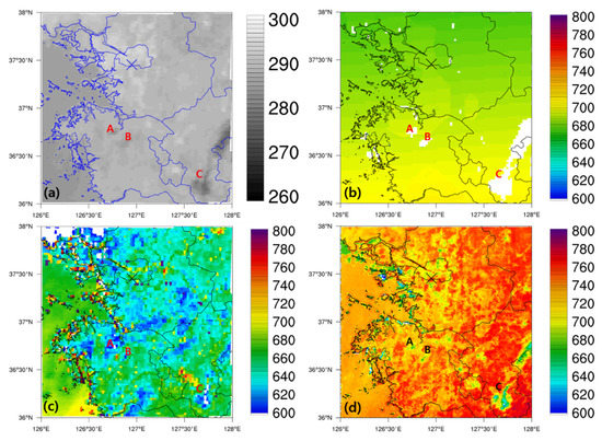 Horizontal distribution of (a) brightness temperature (K) at 10.5 μm and GHI estimates (W·m−2) at 1200 KST of 11 October 2019 over the SNU station from (b) UASIBS-KIER model V2, (c) NMSC-INS model, and (d) JAXA-INS model. The mark X is the location of SNU station. A, B, C regions indicate the cloudy pixels in each panel.