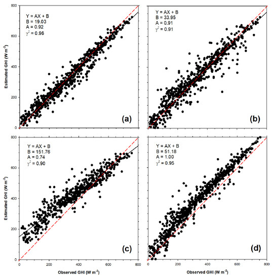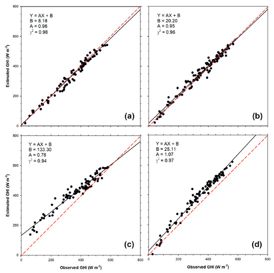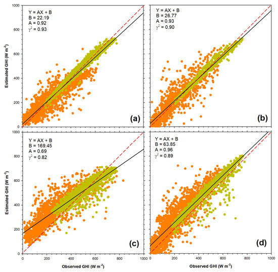 The comparison of hourly mean GHI estimations with observations is conducted by averaging the instantaneous pairs for each hour at two ground stations. Figure 10 shows the scatter plots of the GHI, estimated by four derivation models and measurements at the SNU station every hour. The determination coefficients of linear regressions are all higher than 0.90. In general, error statistics improve with the timescale due to the offset of biases while averaging. The research series of Kim et al. [22,32,58] showed that the RMSE was reduced as timescale increased. The slope of linear regression in the NMSC-INS model is 0.74, implying positive biases for the lower GHI observations (Figure 10c). As accounted for in the previous section, the JAXA-INS model estimates solar irradiance that is positively biased for all hours. Similar characteristics are also found in the FUA station, as illustrated in Figure 11. The positive biases produced by the JAXA-INS model are eliminated at the FUA station.
