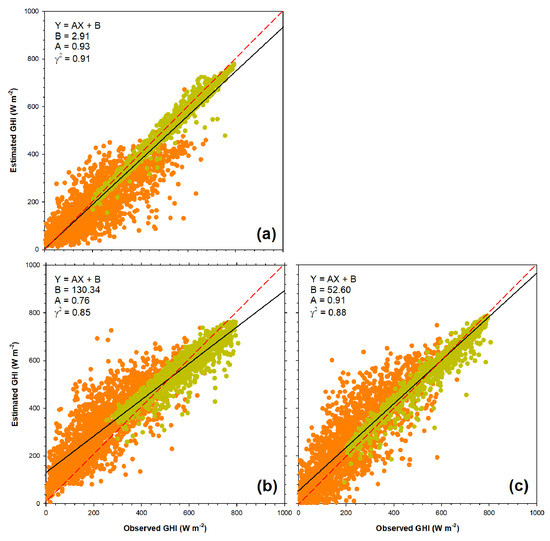 Figure 8 shows scatter plots of all sky GHI estimates together with GHI measurements at the SNU station during the investigation period. All estimates from all models (except NMSC-INS) are highly correlated with the observations: γ2 = 0.93 for the UASIBS-KIER model V1; γ2 = 0.90 for the UASIBS-KIER model V2; γ2 = 0.82 for the NMSC-INS model; and γ2 = 0.89 for the JAXA-INS model. In Figure 8b,c, NMSC-INS and JAXA-INS models generate cloudy sky GHI estimates that are positively biased for the GHI measured lower than 500 W·m−2, resulting in a larger intercept than the UASIBS-KIER model series. The dispersion of GHI pairs is smaller when sky is determined to be clear. This is understandable, as it is more complicated to parameterize the extinction of solar irradiance owing to cloud droplets or ice particles [53,54,55,56]. Furthermore, there are fewer deviations from the clear sky GHI in the UASIBS-KIER model series when compared to other models (i.e., NMSC-INS and JAXA-INS). The negative biases of clear sky GHI identified in Figure 8c,d might be due to the difference of spatial resolution that results in a failure to determine the clear sky. This will be discussed in greater detail in Section 6. The characteristics of biases for the GHI estimates from all derivation models are also found in the FUA station (see Figure 9).