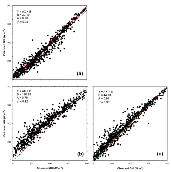 Scatter plot of the hourly mean GHI observations and estimations from the UASIBS-KIER model V2 (a), the NMSC-INS model (b) and the JAXA-INS model (c) at the FUA station. The slope and intercept of linear regression is given together with the determination coefficient in each panel. Red dashed line indicates the reference regression.