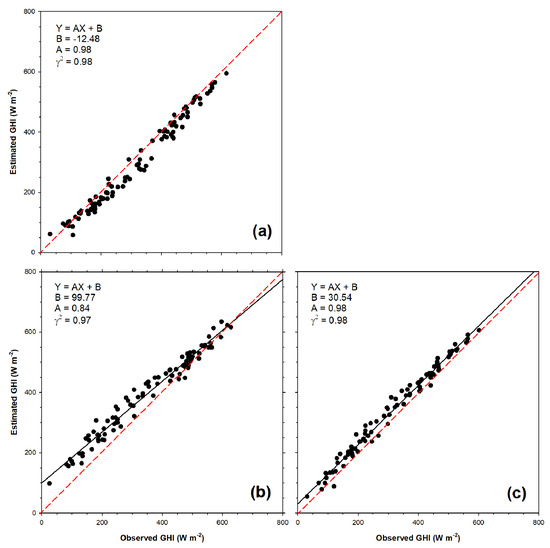 Scatter plot of the daily mean GHI observations and estimations from the UASIBS-KIER model V2 (a), the NMSC-INS model (b) and the JAXA-INS model (c) at the FUA station. The slope and intercept of linear regression is given together with the determination coefficient in each panel. Red dashed line indicates the reference regression.