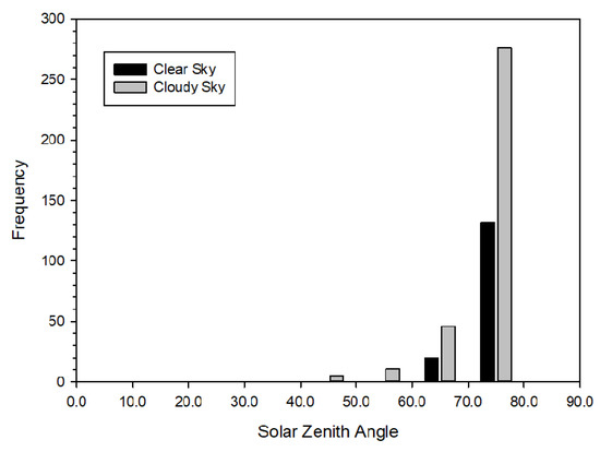 Frequency distribution of solar zenith angle at clear (black) and cloudy (grey) sky from the missing data of UASIBS-KIER model V1 at the SNU station.