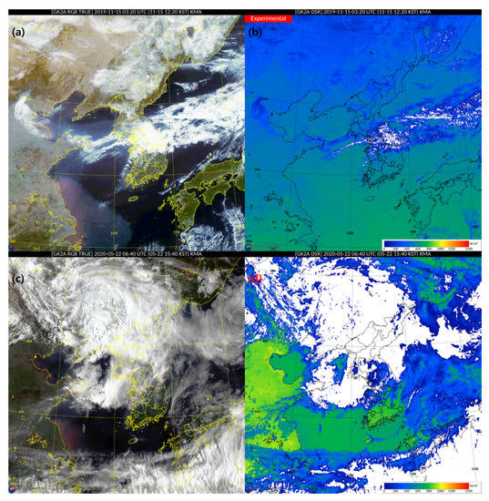 True color image (a,c) and GHI distribution (b,d) from the NMSC-INS model; (a,b) at 1220 KST of November 15, 2019, (c,d) at 1540 KST of 22 May 2020 (taken from http://nmsc.kma.go.kr/homepage/html/satellite/viewer/selectSatViewer.do?dataType=operSat).