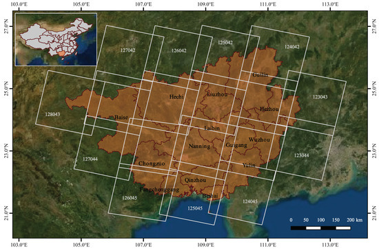 Guangxi, China. The study area is located in the south of China. It includes 14 administrative regions and Nanning is its capital. The whole area extends 18 Landsat scene footprints as shown in the figure, where peripheral footprints are labeled using World Reference System (WRS) Path/Row.
