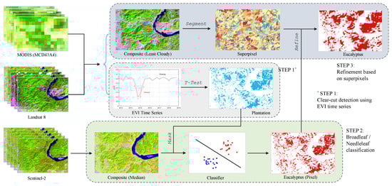 The workflow for identifying eucalyptus plantation is shown in Figure 2 (The whole detection procedure is implemented on GEE, source code can be found at https://code.earthengine.google.com/?accept_repo=users/siatsiatns/eucalypt). Landsat 8 OLI data from year 2013 to 2018, MODIS product MCD43A4 of the same time, and Sentinel-2 MSI imageries from year 2016 to 2018 are adopted, where the MODIS data is employed to validate the quality of Landsat images, i.e., the cloud removal performance, owing to its high repetition rate. The detection procedure is composed of three main steps. First, a time series of Enhanced Vegetation Index (EVI) [29] is constructed from Landsat data for each pixel. And a statistical hypothesis testing is followed to determine whether the pixel belongs to a tree plantation or not based on the idea that tree crops should be harvested in a specific period. Then, a broadleaf/needleleaf classification is applied to distinguish eucalyptus from coniferous trees such as pine and fir using the red-edge bands of Sentinel-2 data, since eucalyptus is the only broad-leaved species cultivated intensively for timbers in the study area. At last, superpixel based refinements is performed to remove the salt-and-pepper effects resulted from per-pixel detection by taking into account that eucalyptus plantations are usually managed parcel by parcel.