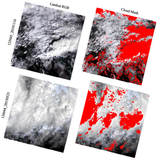 Two examples of Landsat data with poor cloud removal results. The first column shows the true color using RGB bands and the second column shows the cloud pixels (labeled as red) detected by the CFmask algorithm.