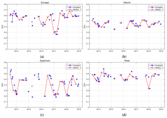EVI time series examples including (a) tree plantation (eucalyptus), (b) cropland (sugarcane), and (c) natural forest from 2013 to 2018. The time series marked with blue asterisks is obtained from Landsat data at an interval of 16 days, whereas the other one marked with red circles is constructed from median EVIs in each period of 3 months. The last example (d) shows a noise case where the EVI series has a sudden drop and rise.
