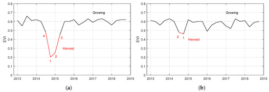Clear-cutting of trees over a plantation gives rise to abrupt drops in the EVI time series. A detector based on statistical analysis to catch the sudden change of EVI in 5–6 years was designed. To start with, each series was segmented into two parts, with one representing the growing stage, and the other the harvest stage. The growing part is supposed to have much more and larger EVI values than the harvest part. In addition, the harvest part must be consecutive in time with a maximum duration of 1 year. The segmentation was accomplished iteratively, starting from extracting the least value as the harvest part, and then extending it by ingesting the adjacent values, as illustrated in Figure 5. A neighboring value was added to the harvest part if it decreased the Sum of Squared Error (SSE) defined as:
