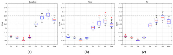 Boxplots of the Top of Atmosphere (TOA) reflectance of (a) eucalyptus, (b) pine, and (c) fir samples from Sentinel-2 data. Image bands covering the visible (B2, B3, B4), the red-edge (B5, B6, B7, B8A), and the near-infrared (B8) region are compared.