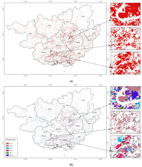 Distribution of eucalyptus plantations in Guangxi. (a) Detected extent of short-rotation eucalyptus plantations. (b) The planting calendar of eucalyptus.