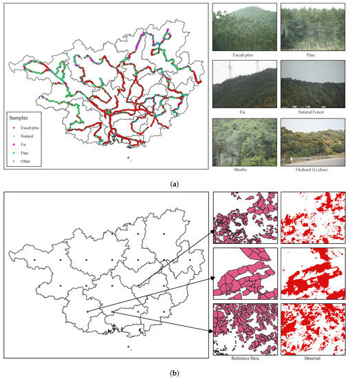 We evaluated the detection result using two different data sources. One is land cover samples acquired during a field survey in 2017, and the other is eucalyptus plantations visually identified based on very high resolution images from Google Earth. The field trip lasted for almost a month, and a total number of 20,327 samples were collected. Each sample was labeled with one of the six land cover categories including forest, grassland, cropland, man-made surface, wetland, and water bodies. Meta information such as collecting date, photo, and simple description was also recorded. For forest and cropland samples, we added a feature describing the vegetation cover, i.e., eucalyptus, pine, natural forest, sugarcane, and so on. Only samples with identified vegetation cover were adopted in our assessment, and there were 12,117 of them in total, see Figure 8a. The error matrix and evaluation metrics based on these samples are shown in Table 2 (the first tabular). The overall accuracy achieves 87.97%, and the producer’s accuracy as well as the user’s accuracy of eucalyptus is, respectively, 63.85% and 66.89%. For evaluation based on high resolution data, we selected 19 regions of size 4.45 km × 4.45 km on a regular grid, and obtained the reference data via visual interpretation of Google Earth images, see Figure 8b. All the 19 regions, 418,546 pixels in total, were evaluated together, and the error matrix as well as accuracy metrics are shown in Table 2 (the second tabular). The overall accuracy reaches 93.59%, which is about 5.62% higher than that in the previous assessment owning to the increase of the detection accuracy for non-eucalyptus pixels. The producer’s accuracy in both assessments demonstrates that the proposed method tends to underestimate eucalyptus plantations. There are many reasons for that, but the lack of data due to frequent cloud and the environmental policy to restrict forest logging in recent years are the two most crucial ones. This will be explained in more details in Section 5.