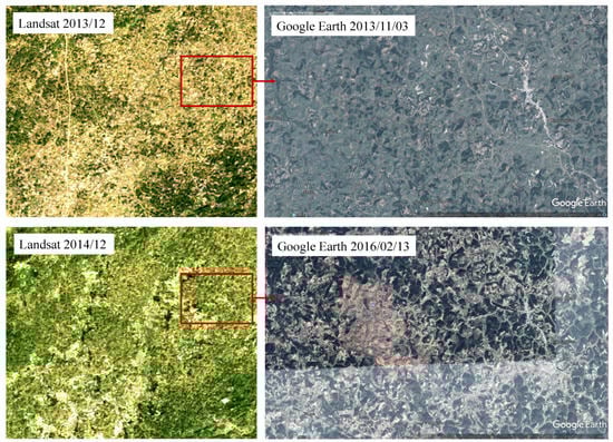 A eucalyptus planting calendar was also produced, where the planting date was obtained from the date when the EVI reaches the minimum value. Due to frequent cloud interference and relatively low repetition rate of Landsat 8, it is impractical to retrieve the planting date to day or month. We created the planting calendar on a yearly basis, and ignored the offset from the actual planting date to the date corresponding to the least EVI. The result is shown in Figure 7b and the planting area of each year is calculated in Table 3. It demonstrates that the planting area of eucalyptus reaches a peak in 2014, accounting for almost 39.26% of the total area planted through 2013 to 2018. A further review of Landsat data and high resolution Google Earth images revealed that a large number of sugarcane fields were converted to eucalyptus plantations in 2014, see Figure 9 for an example in Qinzhou. In addition, the Landsat 8 data archive in 2014 over the study area is continuous, but not the same case for other years. Take year 2013 for example, not until July did Landsat 8 begin to acquire data in some regions, making the proposed method fail to capture the clear-cut happened in this year and leading to underestimation of eucalyptus area.