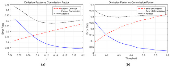 Omission factor vs commission factor. (a) The change of error rates of eucalyptus detection as varying d in (3). (b) The change of error rates of eucalyptus detection as varying the threshold in Section 3.4.