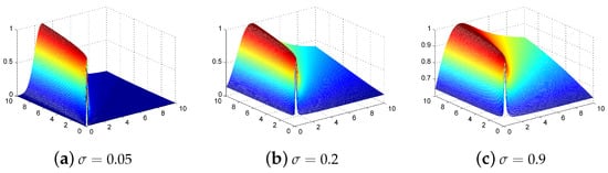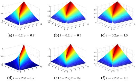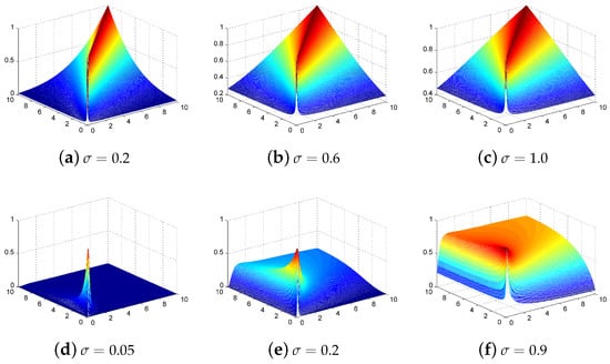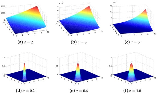 Figure 3. Power-SAM-RBF kernel characteristics with different parameters of t and . - With an increasing parameter of , the Power-SAM-RBF kernel exhibits more characteristics of a global kernel and fewer characteristics of a local kernel. As shown in Figure 3a–c, the response of the kernel becomes less pronounced as increases.
