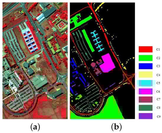 This dataset was acquired by the ROSIS instrument over the University of Pavia, Pavia, Italy in 2001. The image has a pixel resolution of , spectral coverage ranging from 0.43 to 0.86 m, and spatial resolution of 1.3 m per pixel. After discarding noisy and water absorption bands, 103 spectral bands are retained. Figure 6a,b present a false color composite of the University of Pavia images and the corresponding ground-truth data, including nine classes of interest (Table 1).