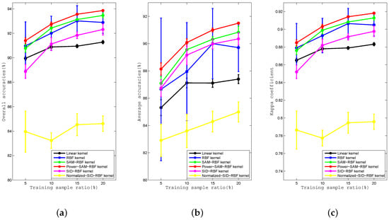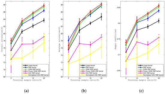 HSIs of the Indian Pines, Pavia University, and Salinas Valley were used as experimental datasets. The results of using different proportions of the data for training revealed that the Power-SAM-RBF and SAM-RBF kernels achieve enhanced performance compared to the Linear, RBF, SID-RBF, and Normalized-SID-RBF kernels. The superiority of these two kernels, particularly the Power-SAM-RBF kernel, becomes more pronounced as the proportion of training data increases. For Indian Pines, when the percentage of training data is , the OA, AA, kappa coefficient of Power-SAM-RBF kernel get the highest values of , , and 0.8561, respectively. For University of Pavia, when the percentage of training data is , the OA, AA, kappa coefficient of Power-SAM-RBF kernel get the highest values of , , and 0.9182, respectively. For Salinas Valley, when the percentage of training data is , the OA, AA, kappa coefficient of Power-SAM-RBF kernel get the highest values of , , and 0.9336, respectively.