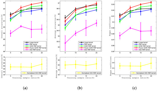 In summary, there are three main conclusions to be drawn from this study. First, the spectral-similarity-based kernels discussed in this paper can satisfy Mercer’s condition. Additionally, the Power-SAM-RBF and SAM-RBF kernels for the SVM method can achieve significantly enhanced performance in terms of HSI classification, particularly the Power-SAM-RBF kernel. Second, either extremely high or extremely low similarities between the spectral signatures of different classes may yield better performance for the Power-SAM-RBF kernel compared to the other kernels. Finally, the Power-SAM-RBF kernel achieves even greater classification superiority with a larger training set compared to other kernels. The classification performance by using the proposed kernels for SVM is also not too distinct. Therefore, in a future study, we will employ spectral-similarity-based kernels in multiple-kernel methods to validate their efficiency in terms of HSI classification. Meanwhile, we will make efforts to explore more effective novel kernels for HSI classification.