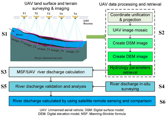 The river discharge was calculated using data collected by a UAV and remote sensing satellites. The UAV had cameras with three spectral channels and a GPS, so it contributed to the river discharge in two ways (Figure 4). First, the camera on the UAV platform was used to capture precise information about the river channel. Flying automatically in preset routes, the UAV continuously recovered images of the river channel surface at a high spatial resolution (5 cm) and sent the images to the base station in real-time. The hydrological parameters used to calculate the discharge, including river channel width, river water surface width, and river channel length, were then determined precisely from the UAV images. Second, topographical data of the river channel were also acquired from the elevation survey undertaken by the GPS on the UAV. As the images are taken by the camera, the GPS records the horizontal and vertical coordinates of the visual images. The elevation and the horizontal distance of the river channel were generated and calculated from the vertical coordinates.