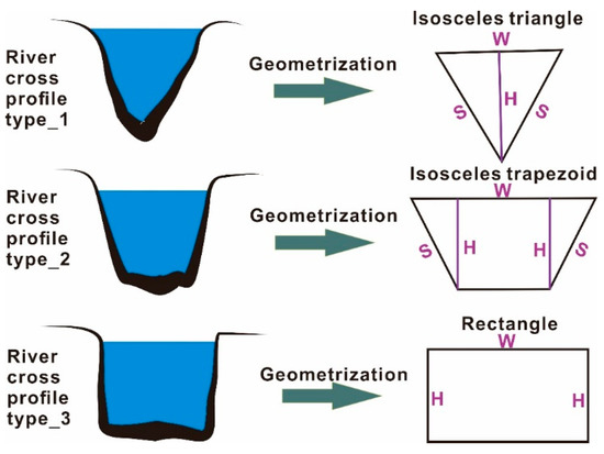 Schematic of the three river profiles. W is the river width, S is the length of the cross-section of the river channel, and H is the water depth.