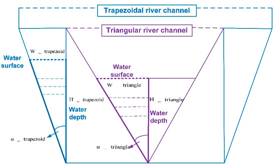 The water depth is needed to calculate the river discharge. The fact that it is difficult to directly survey the water depth accurately with a UAV or other type of remote sensing satellite posed a challenge for our method. To address this issue, we considered the relationship between the river water depth and the width of the water surface for triangular or trapezoidal river cross-sections (Figure 5) and found that, for these river cross-sections, there was a tangential relationship between the width of the water surface (W_trapezoid and W_triangle in Figure 5) and the water depth (H_trapezoid and H_triangle). The α_ trapezoid and α_ triangle angles can be surveyed, so the width of the water surface can be obtained as long as there are UAV or satellite data for the river channel section. However, this relationship did not apply to rectangular river channels.